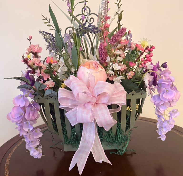 The Donna: Artistry in Bloom Sophistication meets seasonal charm in The Donna. Housed in a uniquely crafted green metal basket with intricate cutout detailing, this arrangement features a lush blend of pink, purple, and ivory florals. It is more than just a bouquet; it is a statement piece. Ideal for high-traffic residential spaces or as a thoughtful gift, this lovely arrangement is free-standing or can be hung on the wall. The Donna brings a touch of permanent elegance to any environment.